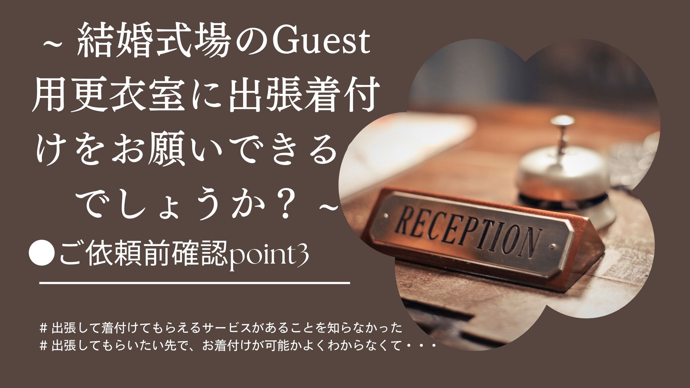 2. セキュリティ面で、外部からの入退室に障りがないか_懸念事項があれば、予めホテルの方には外部から着付けをしていただくことはお話されて、フロントを通さず直接部屋にお越しいただいて大丈夫か確認されてもよいでしょう。