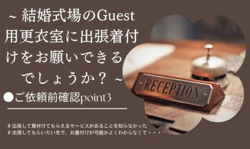 STYLING 結婚式場のゲスト用更衣室に出張着付けをお願いできるのでしょうか? 2022.07.09 Misuzu 出来ます。更衣室はゲストなどが着替えに使用して大丈夫な場所です。 そうは言っても、ご不安なお気持ちお察しします。そこそこ過去の話なのですが、人生で初めてゲスト用更衣室で他人様のお着付けを行った際の事です。一緒に結婚式に参…